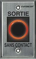 IR No-Touch Request-To-Exit Sensor with French message. Green illuminated ring turns red and 3A relay is triggered when hand is passed in front of the plate. "SORTIE SANS CONTACT" printed on plate. Adjustable relay output time and adjustable sensing range.